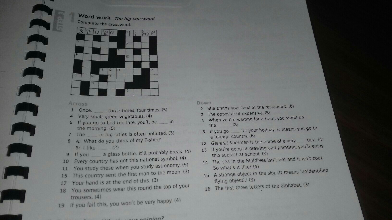 Down :2.waitress 3.cheap 4.platform 5.abroad 12.tall 14.warm 15.UFO 16.ABC