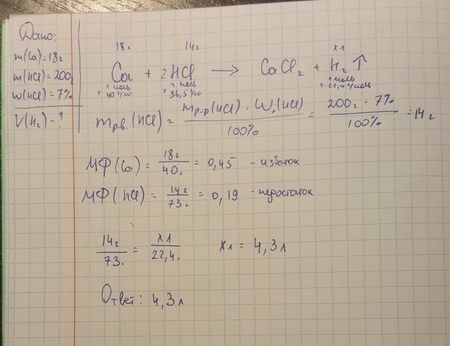 Вычислите объём газа(л),который образуется в результате реакции 18 г кальция с 200 г 7-% раствора соляной кислоты