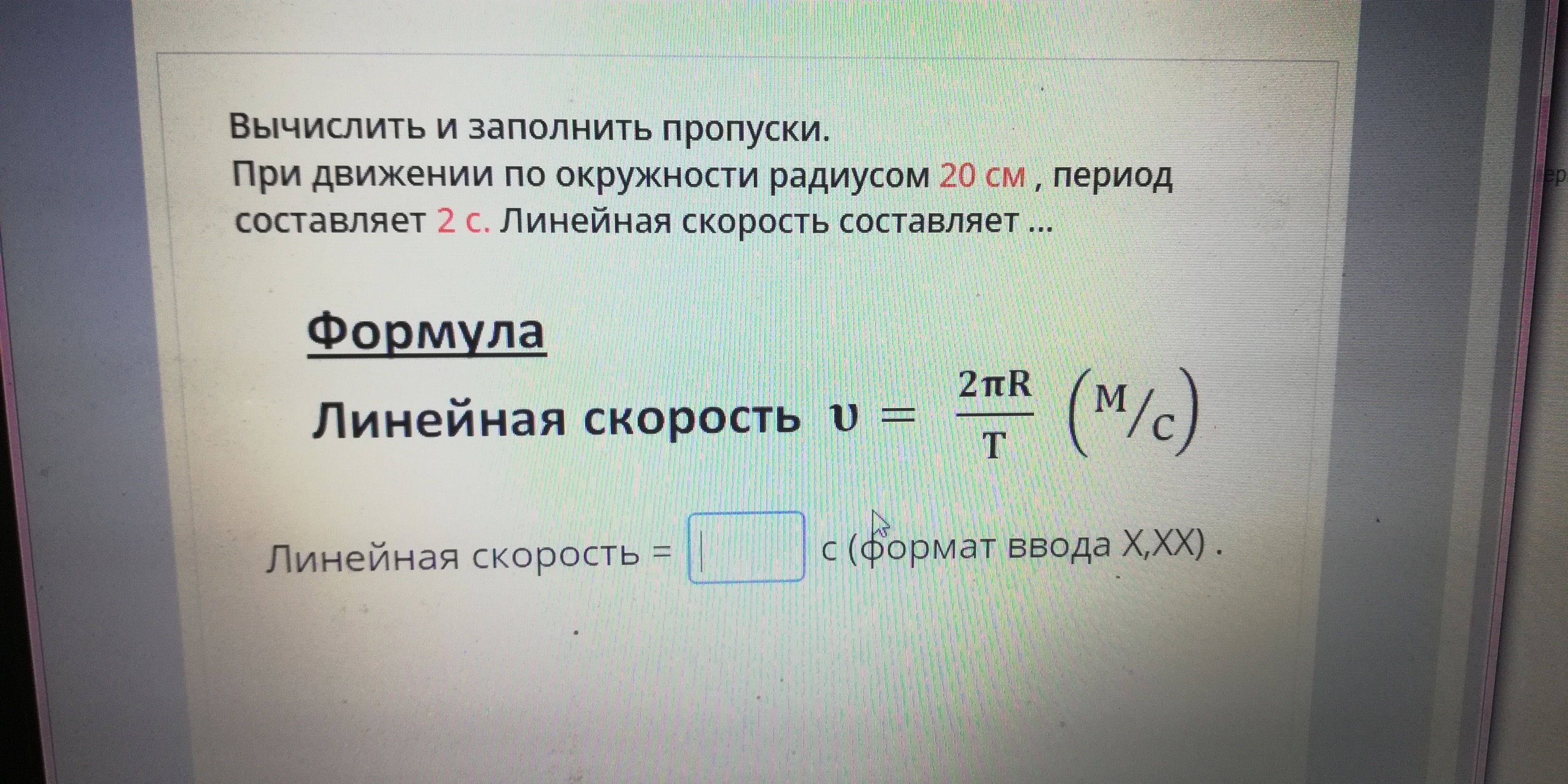R = 20 см 0.2 м u = 2 * π * R / t = 2 * 3.14 * 0.2 м / 2 с = 0.628 м / с