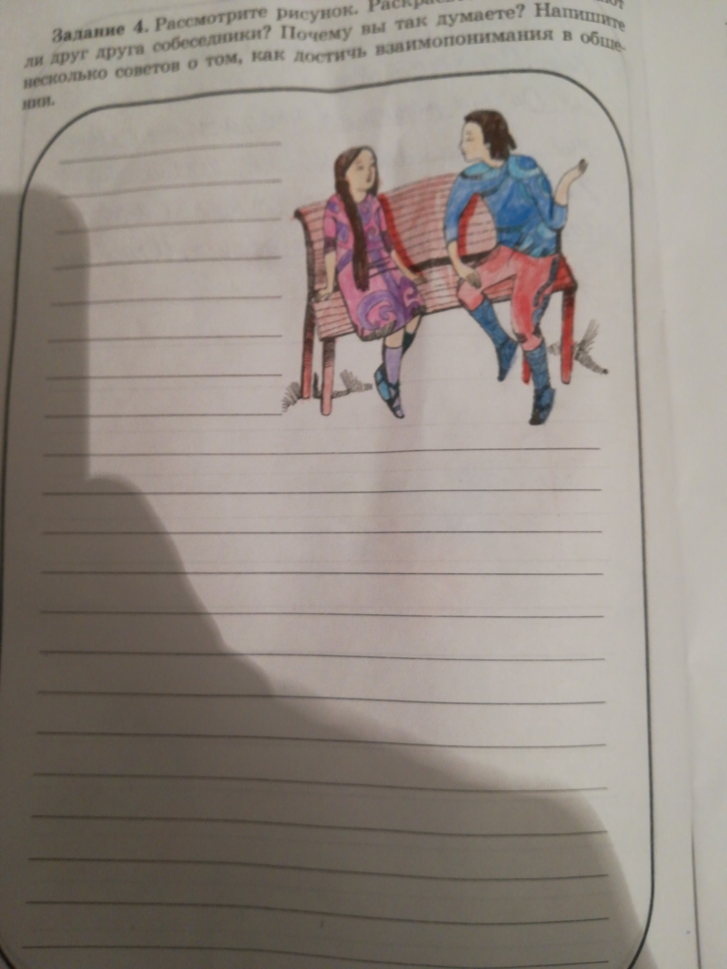 Рассмотрите рисунок раскрасьте его понимают ли друг друга собеседники? Почему вы так думаете? Напишите несколько советов о том, как достичь взаимопонимания в общении