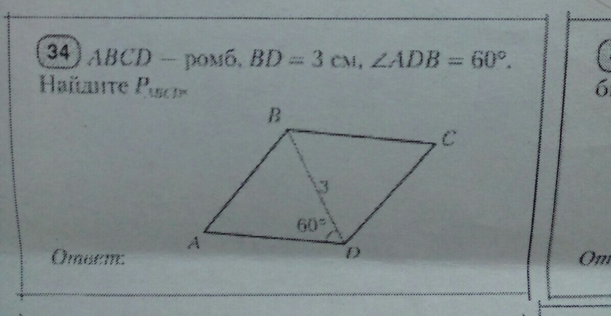 АBCD - ромб. Ми маємо діагональ яка утворила трикутник АВD ( ми знаємо що він рівнобедрений тому що всі сторони ромба рівні) , кут ADB = 60° => трикутник ABD рівносторонній (правильний) - всі його сторони рівні, нам відома одна із них BD = 3см отже BD=AB ; AB= BC=CD=AD=3см