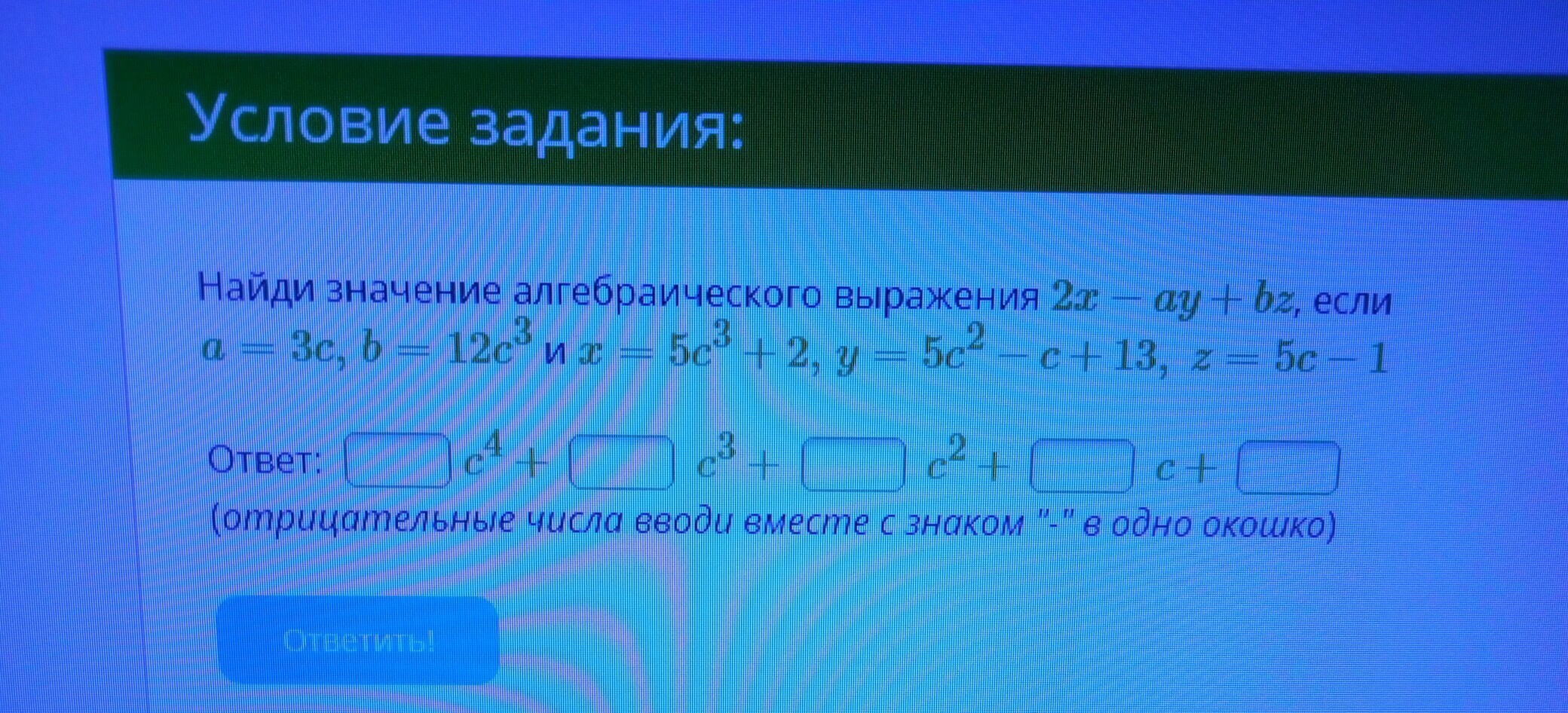 .........=2(5с³+2) - 3с(5с²-с+13)+12с³(5с-1)=10с³+4 - 15с³+3с² - 39с+60с^(4) - 12с³=60с^(4) + (-17с³) + 3с² + (-39с) + 4
