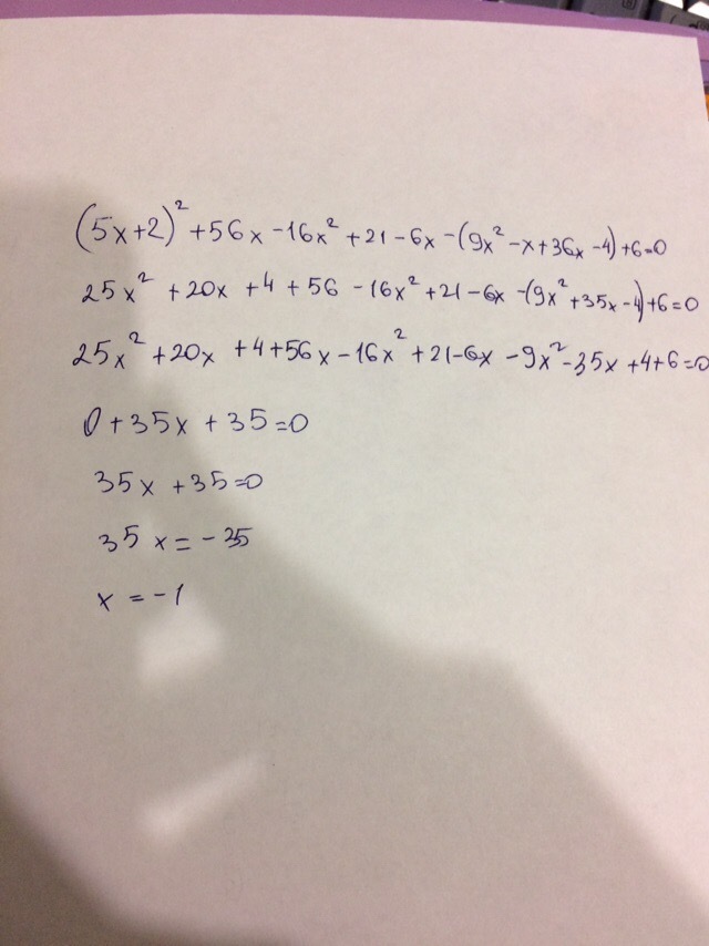 1. (25х+10х+10х+4)+(56х-16х^2+21-6х)-(9х^2-х+36х-4) = 0