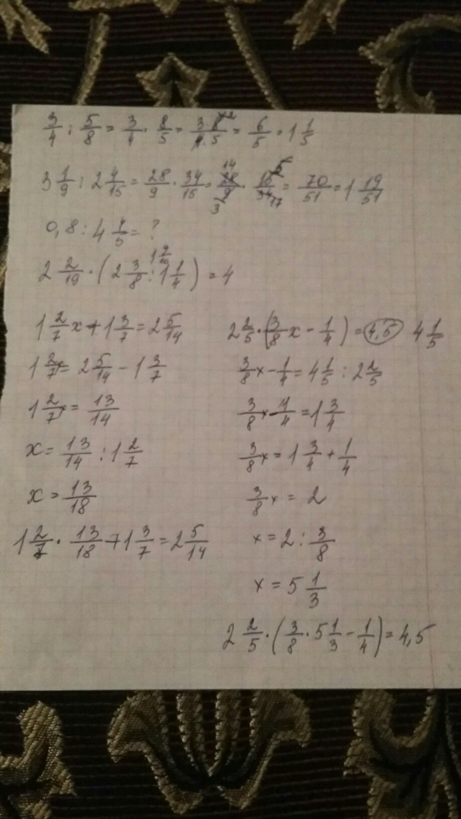 Помогите пожалуйста решить. 3/4÷5/8; 3 целых 1/9 ÷ 2 целых 4/15; 0,8 ÷ 4 целых 4/5; 2 целых 2/19 × (2 целых 3/8 ÷ 1 целую 1/4); 1 целая 2/7 х + 1целая 3/7 = 2 целых 5/14; 2 целых 2/5 × (3/8 х - 1/4) = 4,5