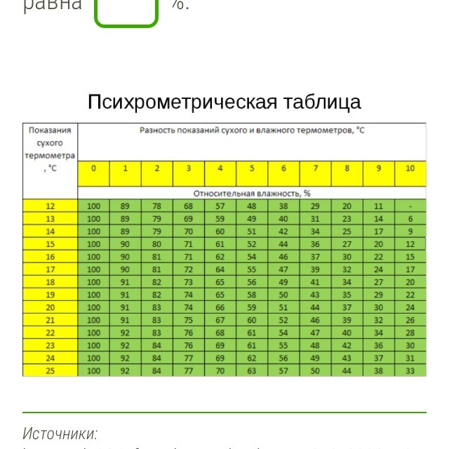 Сухой термометр показывает 17 °С, а смоченный — 12 °С. Найди относительную влажность, используя данные таблицы.