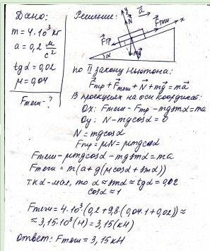 Автомобіль, маса якого 2 т, рухається вгору. На ділянці шляху довжиною 37,5 м його швидкість збільшилася від 5 до 10 м/с. Вважючи рух автомобіля рівноприскореним, визначте силу тяги двигуна, якщо коефіцієнт опору руху 0,02, а кут підйому 30