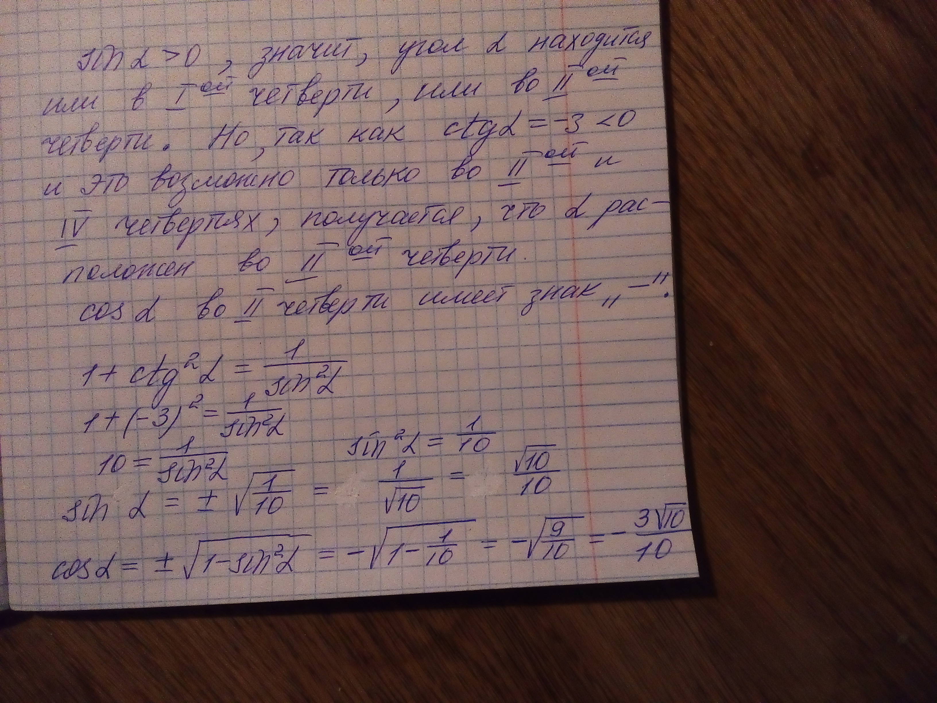 Найдите cosa, если ctga=-3 и sina>0
