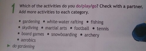 GO: fishing, skydiving, white-water rafting, snowboarding