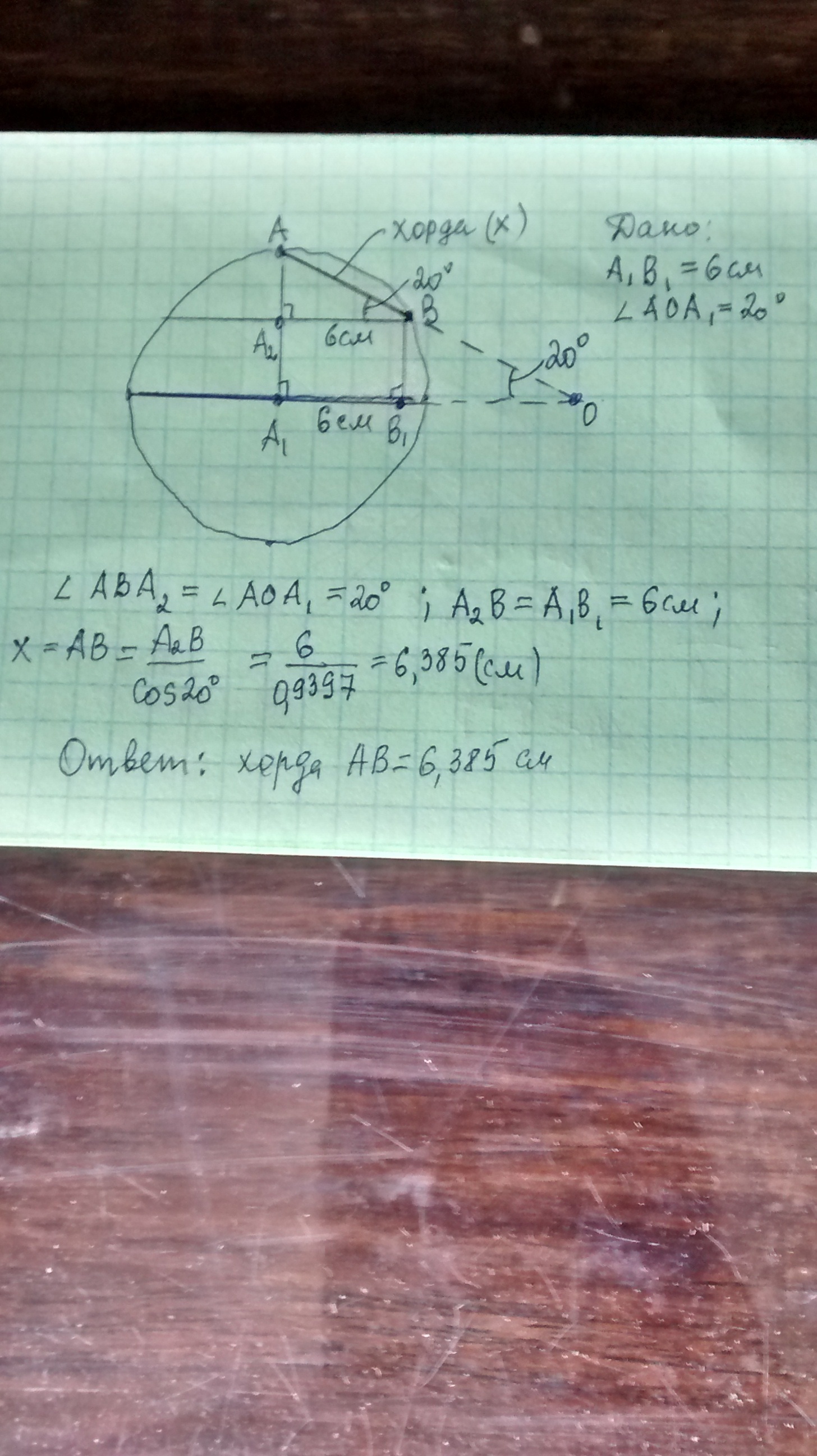 Угол между прямыми содержащими диаметр окружности и ее хорду не имеющую с ним общих точек равен 20 градусов. Найдите длину этой хорды если ее проекция на диаметр равна 6см