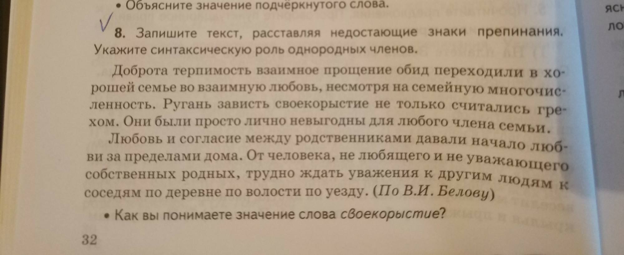 Доброта,терпимость,взаимное прощение.Ругань,зависть,своекорыстие.Просто,лично.По деревне,по волости,по уезду.Синтаксическая роль первых подлежащее,вторых подлежащее,третьих обстоятельство,последних дополнение.