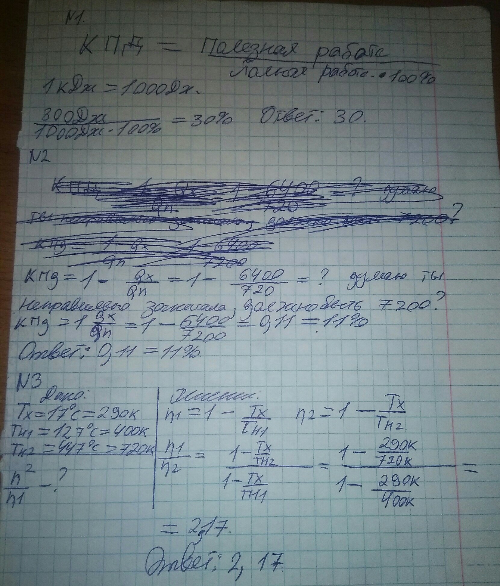 1) В тепловой машине газ получив 1кДж энергии совершил работу равную 300Дж. Найти КПД тепловой машины.