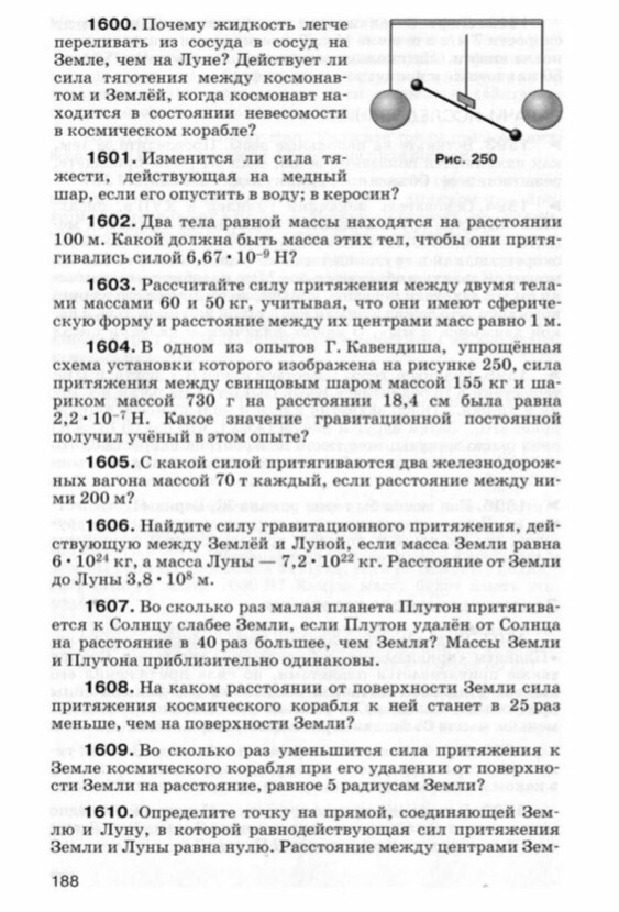1603. Дано М1=50кг, М2=60кг, R=1м. Найти F=? Решение F=6.67е-11*50*60/1²=2.001е-7 Н