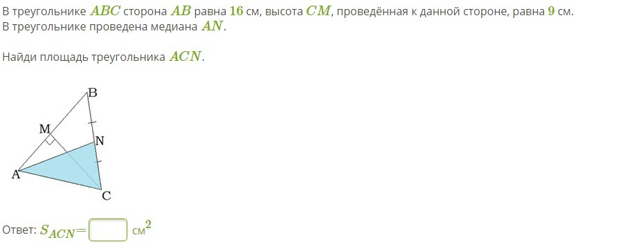 Медиана делит треугольник на два равновеликих треугольника, то есть S ΔАNС=S ΔABN⇒ S ΔANC= S ABC/2=72/2=36 см²