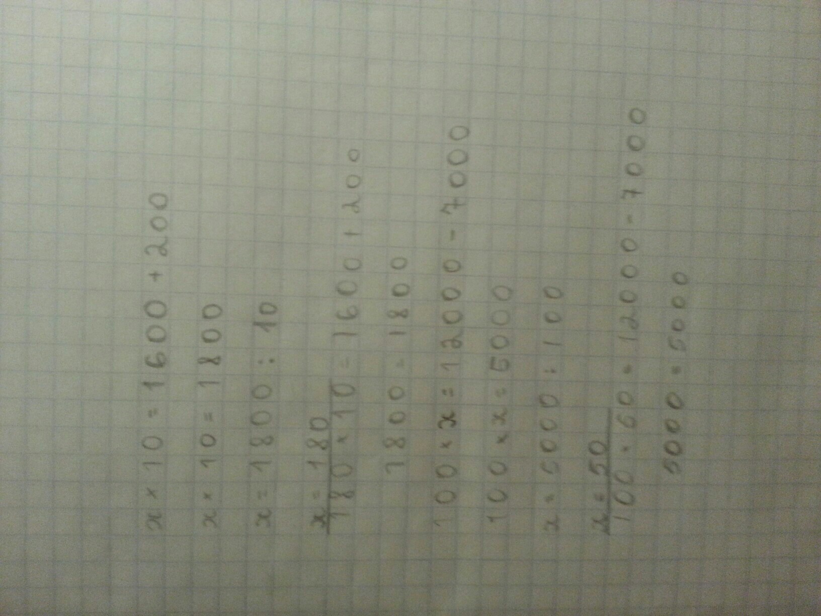 Реши уравнения и проверь. б) х ×10 = 1600+200. 100×х=12000-7000. х÷10 =3400+1900. 96800÷х=5840-5740.