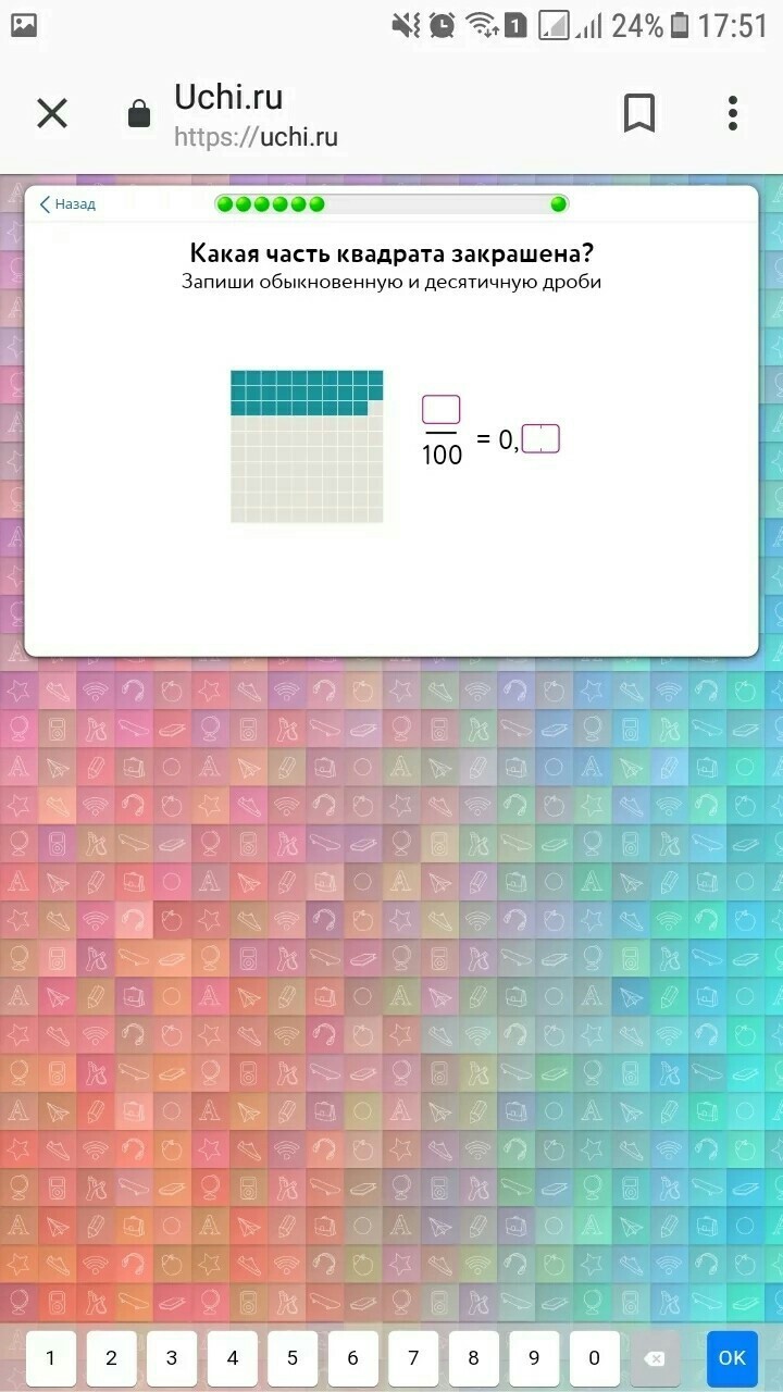 По знаменателю (знаменатель - число, которое находится в нижней части дроби; делитель в дроби) видим, что квадрат состоит из ста (100) квадратиков. Посчитаем количество закрашенных в синий квадратиков и узнаем числитель (числитель - число, которое находится в верхней части дроби; делимое в дроби). Числитель равен 29.