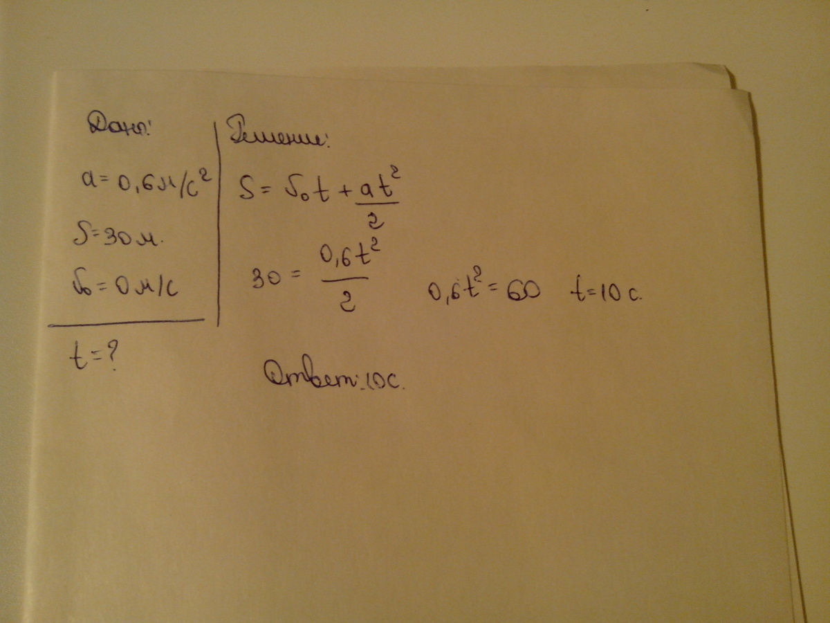 за какое время автомобиль двигался. из состояния покоя с ускорением 0.6 м/с (в квадрате), пройдёт путь 30 метров???