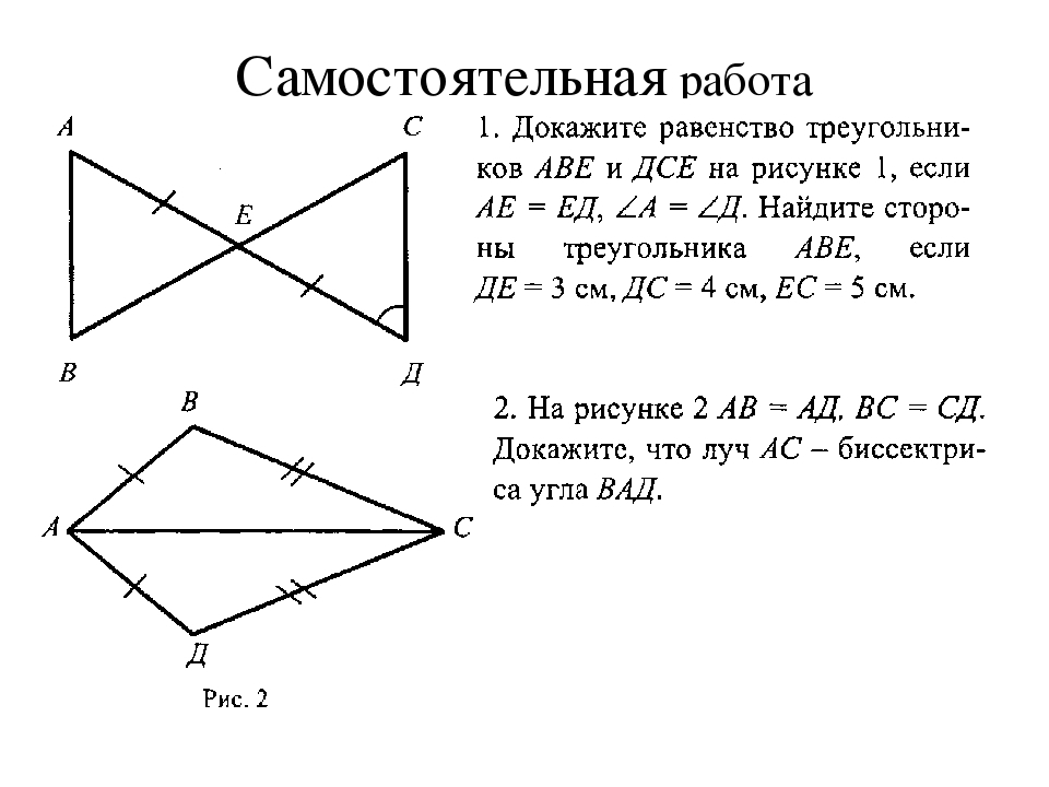 1. Т.к. АЕ=ЕД, ∠А=∠Д, ∠АЕВ=∠ДЕС (вертикальные), то треугольники АВЕ и ДСЕ равны по второму признаку - по стороне и двум прилежащим к ней углам.