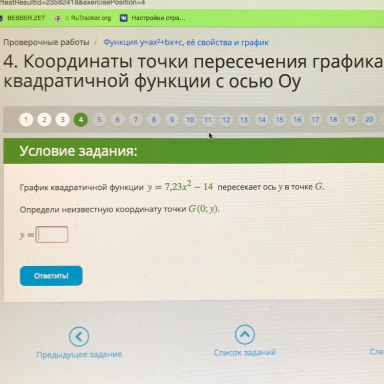 надо подставить в уравнение y = 7.23 x² - 14 значение точки в х=0 и получить y = 7.23 * 0 - 14 = -14