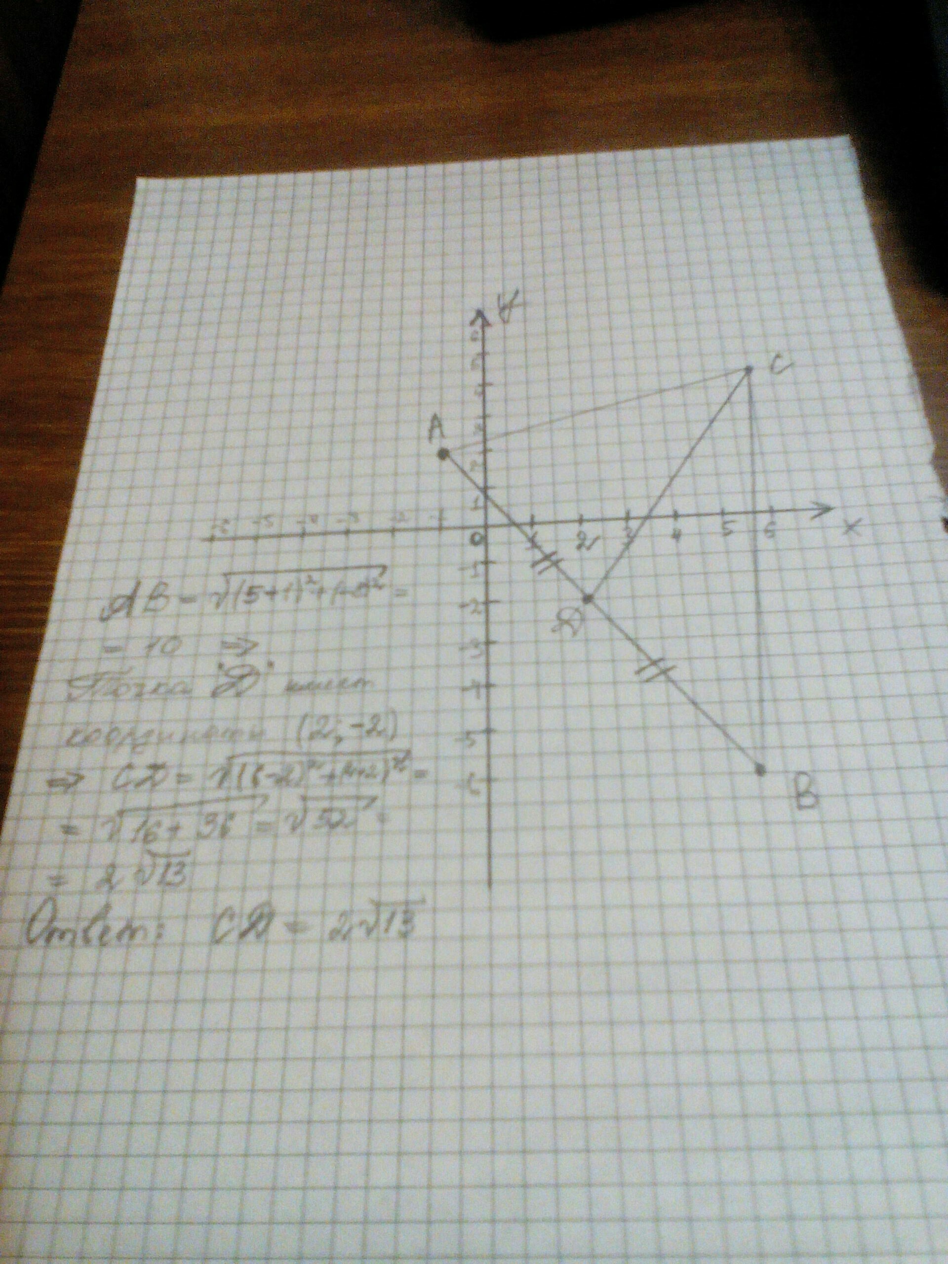 ⦁ Найдите медиану CD треугольника АВС, вершины которого имеют координаты: А(-1; 2), В(5; -6), С(6; 4) . Помогите пожалуйста