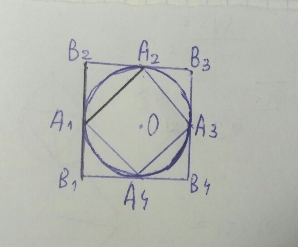 окружность вписана в квадрат B₁B₂B₃B₄ его сторона будет равнаB₁B₂=2R, где R - радиус рассматриваемой окружности.