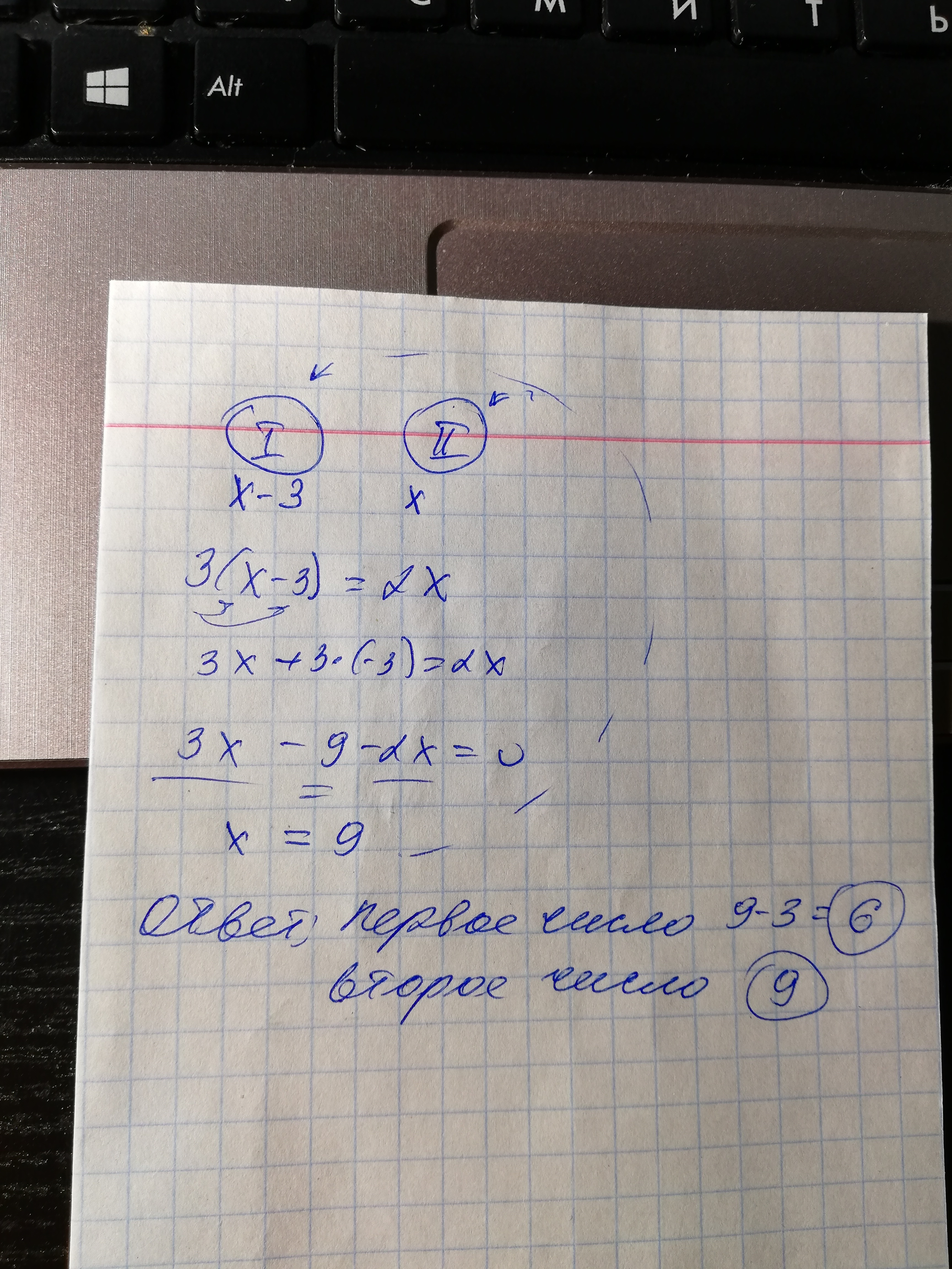 Одно из двух чисел меньше другого на 3.Если первое число умножить на 3,а второе-на 2,то получиться одинаковые результаты.Найдите данные числа.