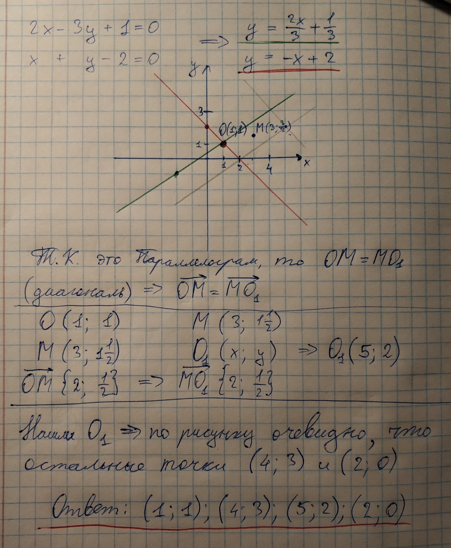 найти координаты вершин параллелограмма если известны уравнения двух его сторон 2x-3y+1=0, x+y-2=0 и точка пересечения диагоналей M(3;3/2).