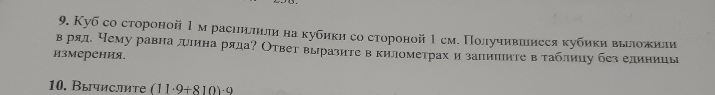 сторона куба 1м=100см,его объем 100*100*100=1 000 000 см³,значит его можно разделить на 1 000 000 кубиков со стороной 1 см и если выложить их в ряд,то длина этого ряда будет 1 000 000см=10 000м=10 км