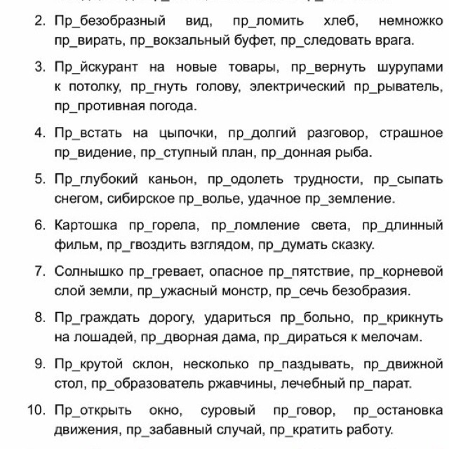 10.Приоткрыть, приговор,приостановка, презабавный, прекратить.