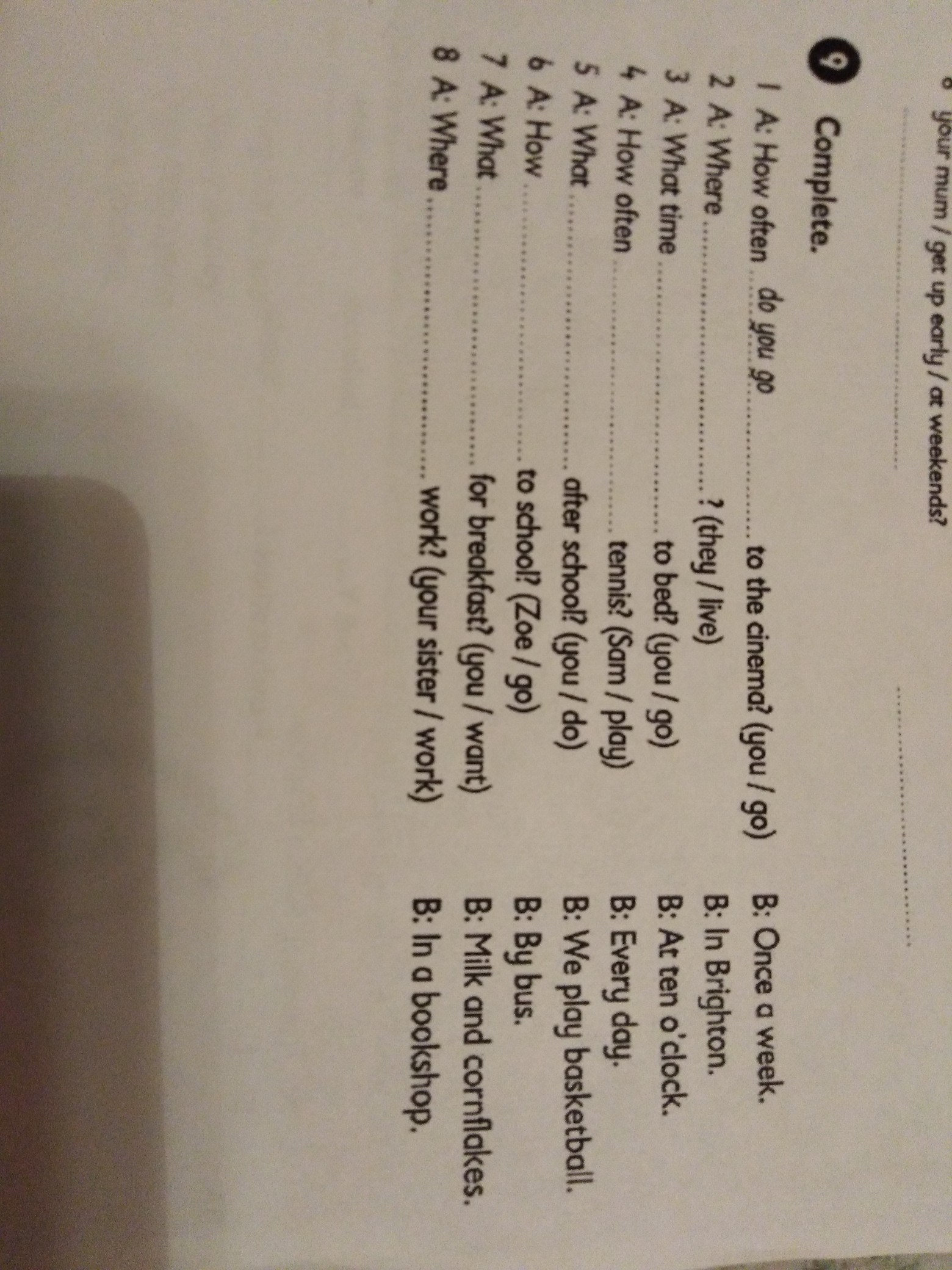 2 do they live.3 do you go to bed 4.does Sam play tennis 5.do you do after school 6.does Zoe go to school 7. do you want for breakfast 8.does your sister work