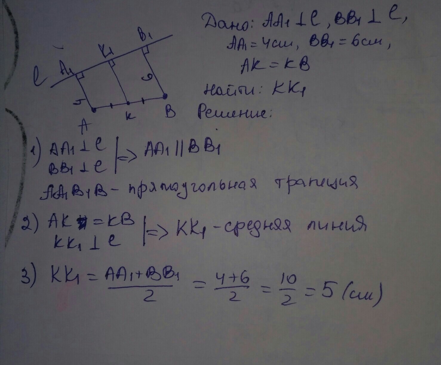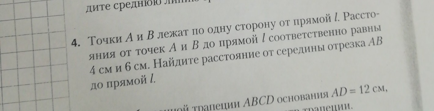 Точки A и B лежат по одну сторону от прямой l. Расстояние от точек A и B по прямой l соответственно равны 4см и 6 см. Найдите расстояние от середины отрезка AB до прямой l.