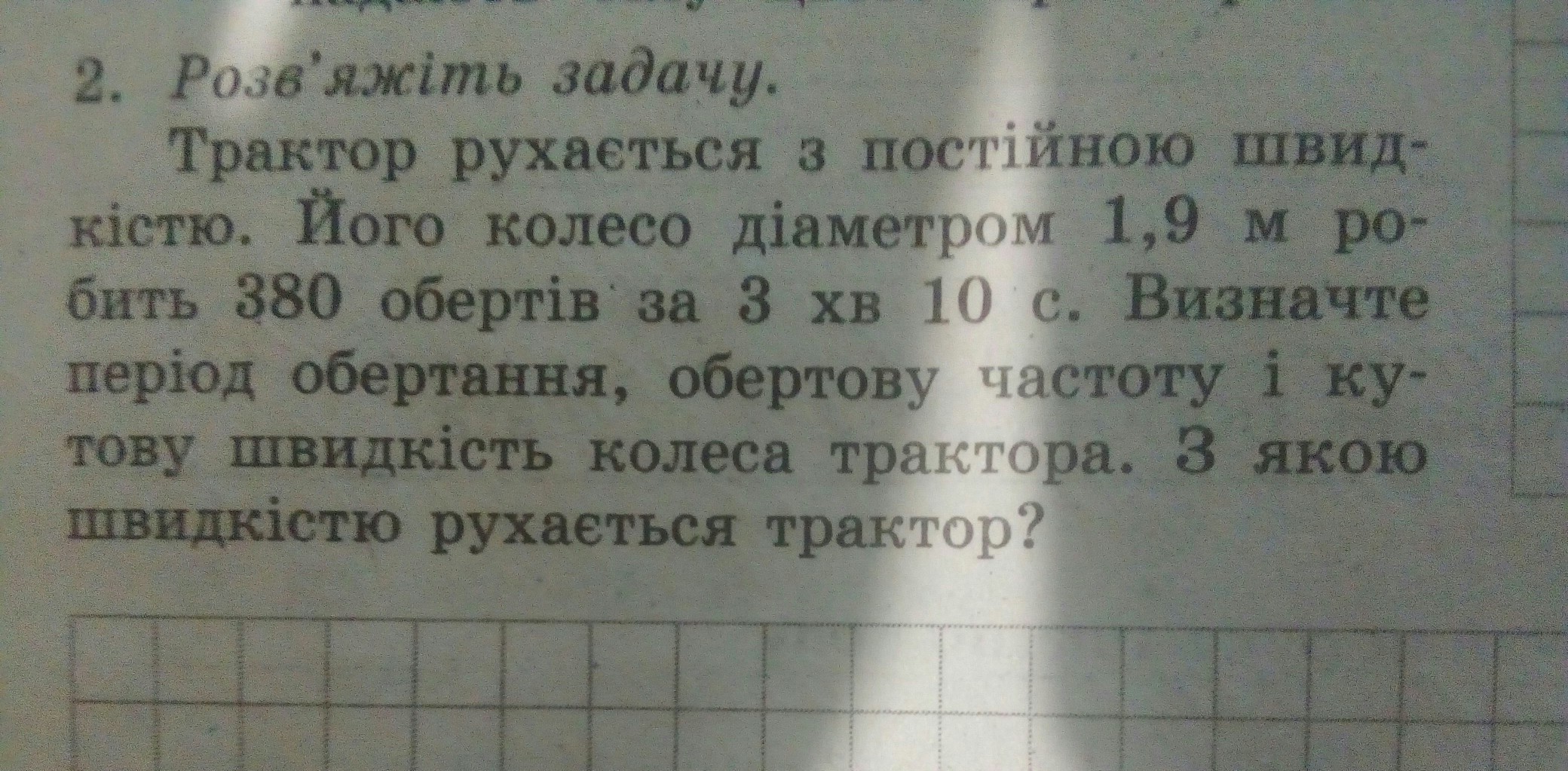 Лінійна швидкість трактора: v = ω•d/2 = 4π•1,9/2 = 3,8π = 12 м/с.