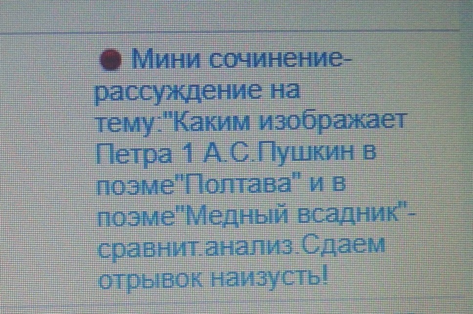 Образ Петра I интересовал А. С. Пушкина всю жизнь и рассматривался во многих произведениях поэта , но ярко великий царь изображается в поэмах «Полтава» и «Медный всадник» . И там, и тут предстает образ величественного, умного, твердого властителя, действительно Петра Великого. Но отношение Пушкина к своему герою неоднозначно. В поэме «Полтава» Петр показан как полководец, ведущий войска к победе.