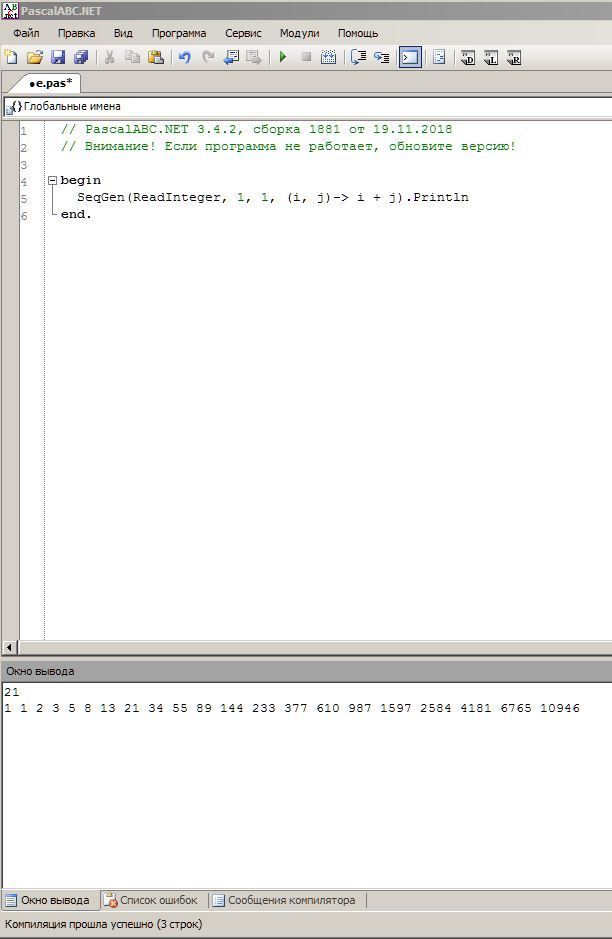 Обрати внимание! longint может хранить значения только до , поэтому конкретно в этой программе вывод будет достоверным только для N ≤ 46. Ты можешь сделать текущую, предыдущую и пред-предыдущую переменные типа int64, и тогда максимальное значение N возрастёт до 92. Для бОльших N тебе придётся писать длинное сложение.