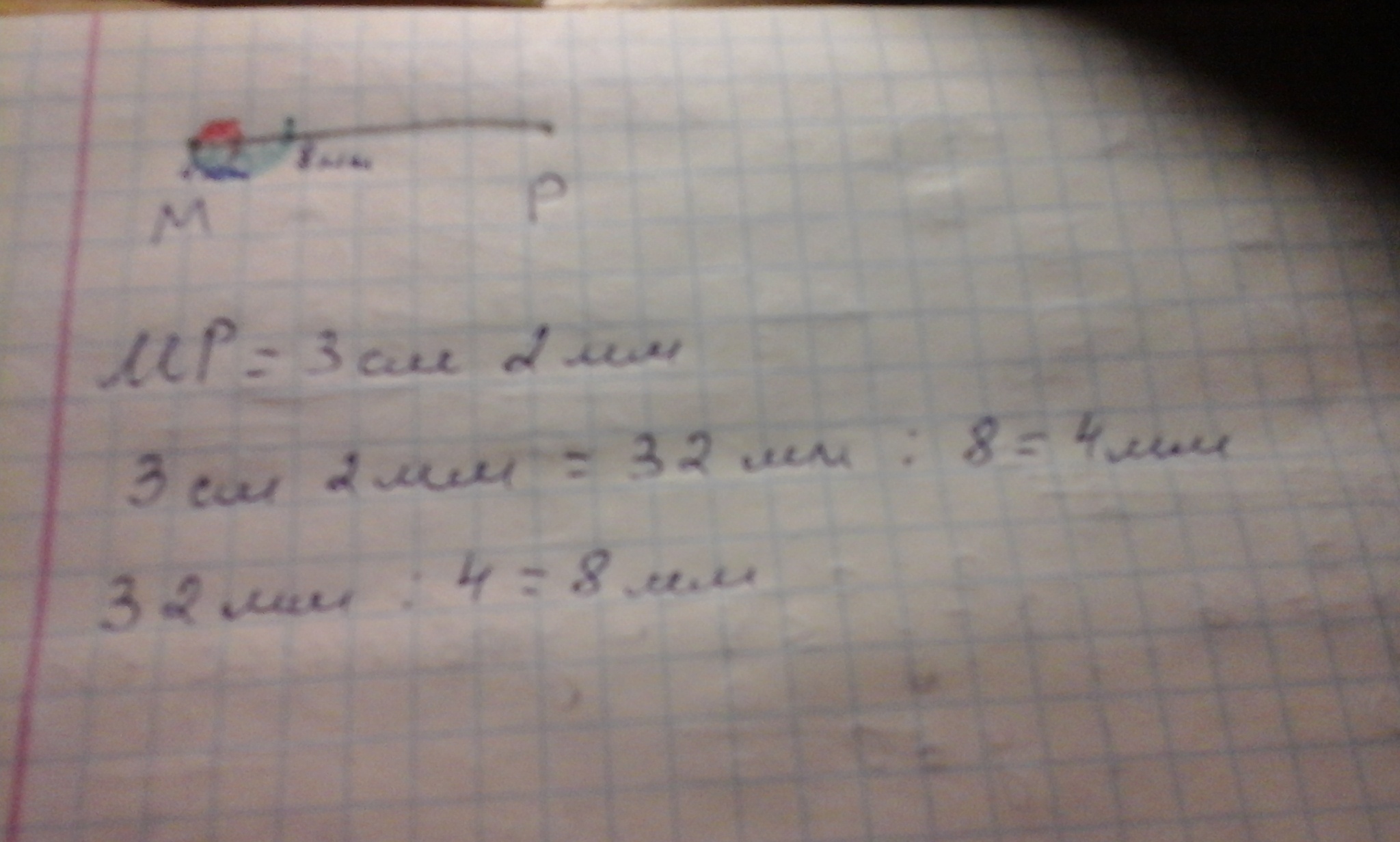 Накресли відрізок МР завдовжки 3 см 2 мм. Покажи його восьму частину червоним олівцем, а чверть синім олівцем