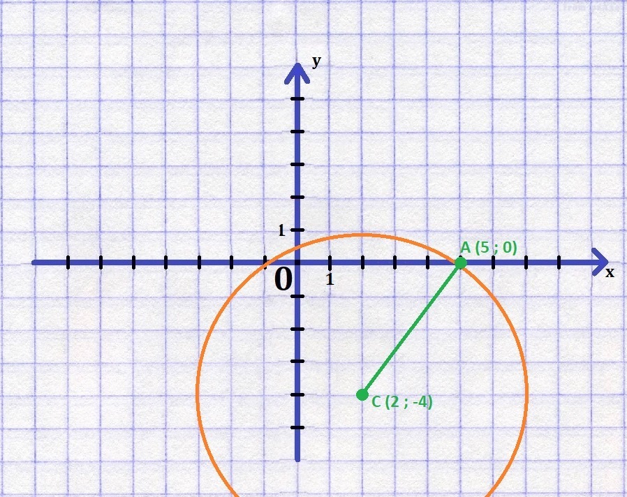 Окружность с центром в С (2 ; -4) пересекает ось абсцисс в точке А (5 ; 0). Написать уравнение этой окружности. Напишите пожалуйста подробно! 9 класс