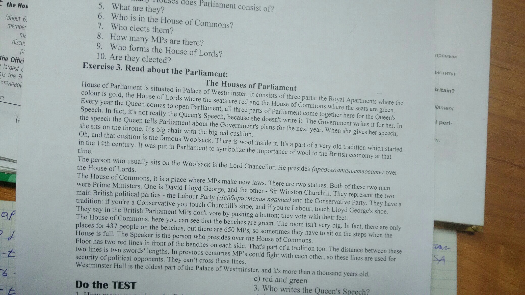 Парламент парламента расположен во дворце Вестминстер. Он состоит из трех частей: Королевские апартаменты, где цвет золотой, Палата лордов, где красные сиденья и сидения зеленые. Каждый год весь парламент собрается здесь для выступления королевы. На самом деле, это не Речь Куцен, потому что она ее не пишет. Правительство пишет для нее. В своем выступлении королева рассказывает парламенту о планах правительства на следующий год. Когда она произносит речь, она садится на трон. Это большой стул с большой, и эта подушка - знаменитый Woolsack. В нем есть шерсть. Это часть очень старой традиции, которая началась в XIV веке. Он был помещен в парламент два символа важность шерсти для британской экономики в то время, человек, который обычно сидит на Woolsack с лордом-канцлером. Он возглавляетнад Палатой лордов. Палата общин, это плацдарм, где депутаты придумывают новые законы. Есть две статуи. Оба этих человека были премьер-министрами. Один из них - Дэвид Ллойд Джордж, а другой - сэр Уинстон Черчилль. Они представляют основные британские политические партии - Лейбористскую партию (euoopuemckas napmus) и Консервативную партию. есть традиция: если вы консерватор, вы прикасаетесь к ботинку Черчилля, а если вы лейбористы, коснитесь обуви Ллойд-Джорджа. Говорят, что в парламенте Великобритании депутаты не голосуют, нажимая кнопку; они голосуют ногами в Палате общин, здесь вы можете видеть, что скамейки зеленые. Комната не только размещает 437 человек на скамейках, но есть 650 депутатов, поэтому иногда, когда Дом - это тот, кто председательствует на этаже, имеет красную линию перед скамейками с каждой стороны. Это тоже часть традиции. Расстояние между этими двумя линиями - длина двух мечей. В предыдущие века депутаты могли сражаться друг с другом, поэтому эти линии используются для обеспечения безопасности политических оппонентов. Они не могут пересекать эти линии.