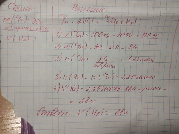 какой объём водорода образуется при взаимодействии 90 г цинка, содержащего 10% примесей, с соляной кислотой