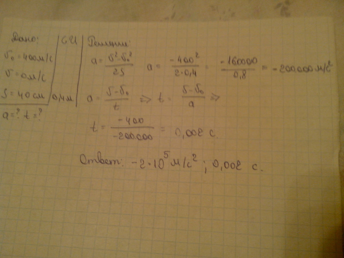 пуля летящая со скоростью 400 м/с ударяется в земленой вал и проникает в него, с каким ускорением и сколько времени двигалась пуля среди вал???