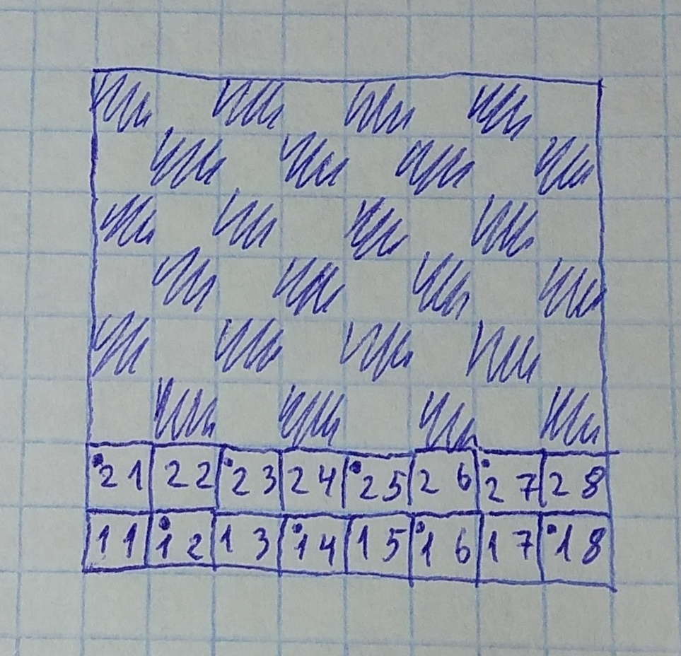 В приложении расписаны координаты некоторых клеток, а также помечены точками те, которые по цвету отличаются от не помеченных. Если поискать, что у них общего, можно обнаружить, что у "невыколотых" клеток сумма координат по горизонтали и вертикали - чётная. Это "свойство" и используем для определения цвета клетки.