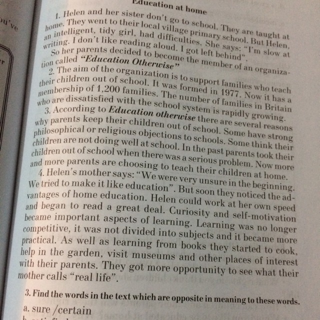 1. Елена и её сестра не ходят в школу. Они учатся дома. Они ходили в местную начальную школу в деревне. Елена - интеллигентная, аккуратная девочка, но у неё были сложности. Она говорит: "Я медленная в письме. Я не могу громко читать. Я осталась позади (отстаю)".
