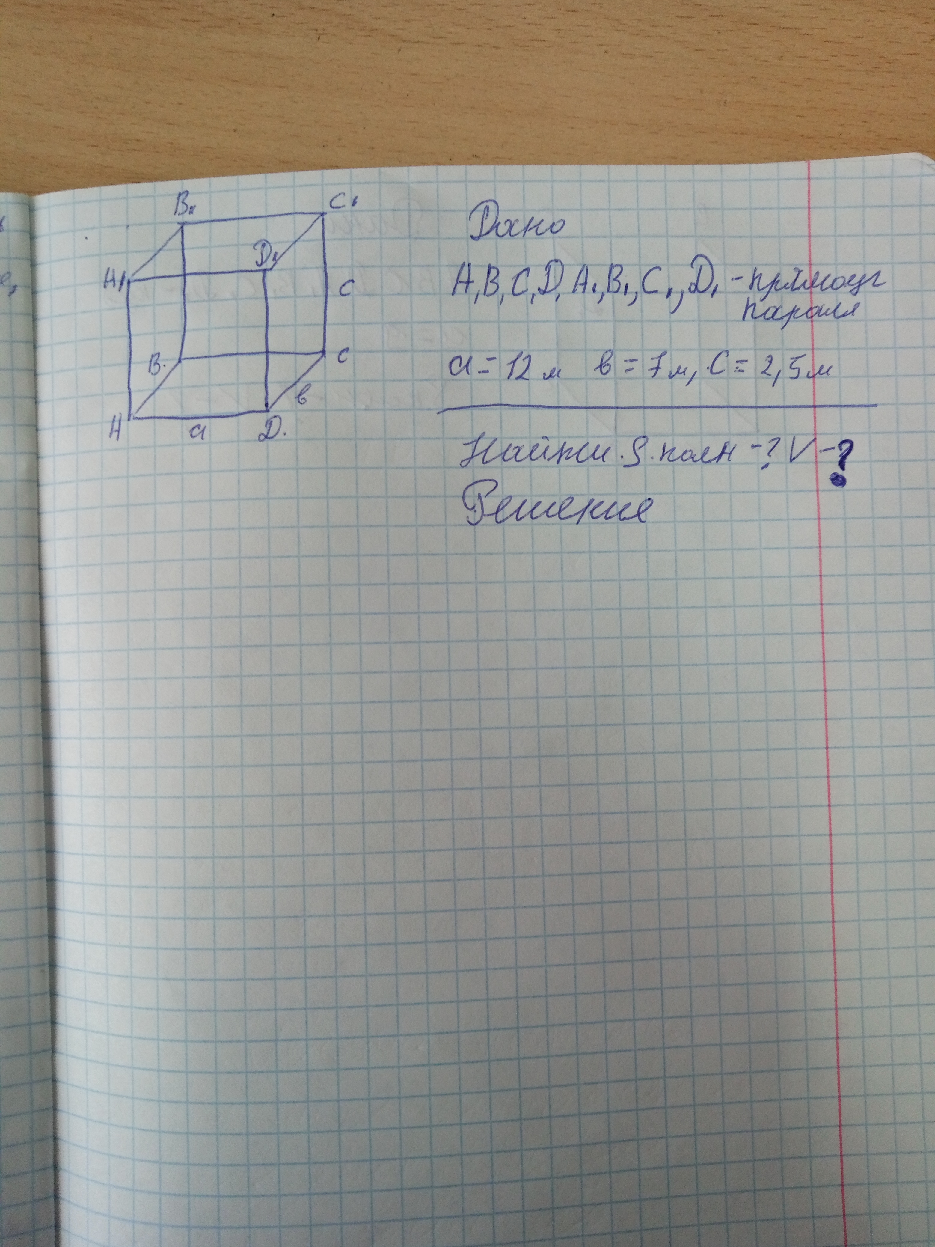 S = (а*с)2 + (b*c)2 + (a*b)2 = (12*2,5)*2 + (7*2,5)*2 + (12*7)*2 = 60 + 35 + 168 = 263 см²