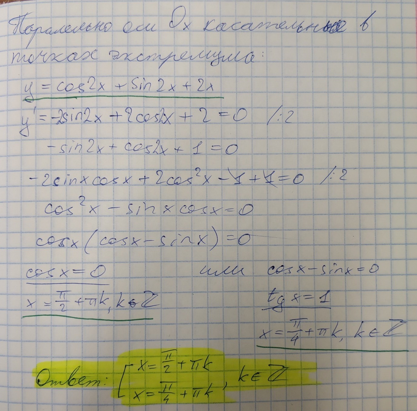 Найти абсциссы точек, в которых касательная к графику данной функции параллельна оси OX y=cos2x+ sin2x+2x