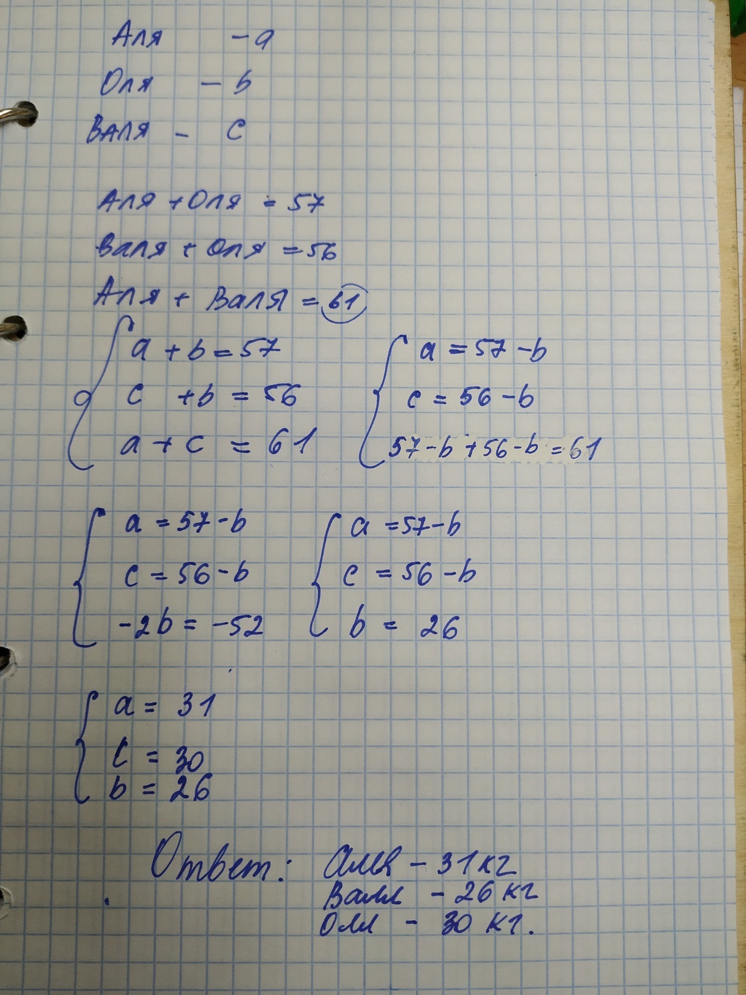 али , оля и валя решили определить свой вес. али вместе с олей вдвоем весили 57 кг ,вес вали вместе с олей составил 56 кг и али вместе с валей -61 кг .
