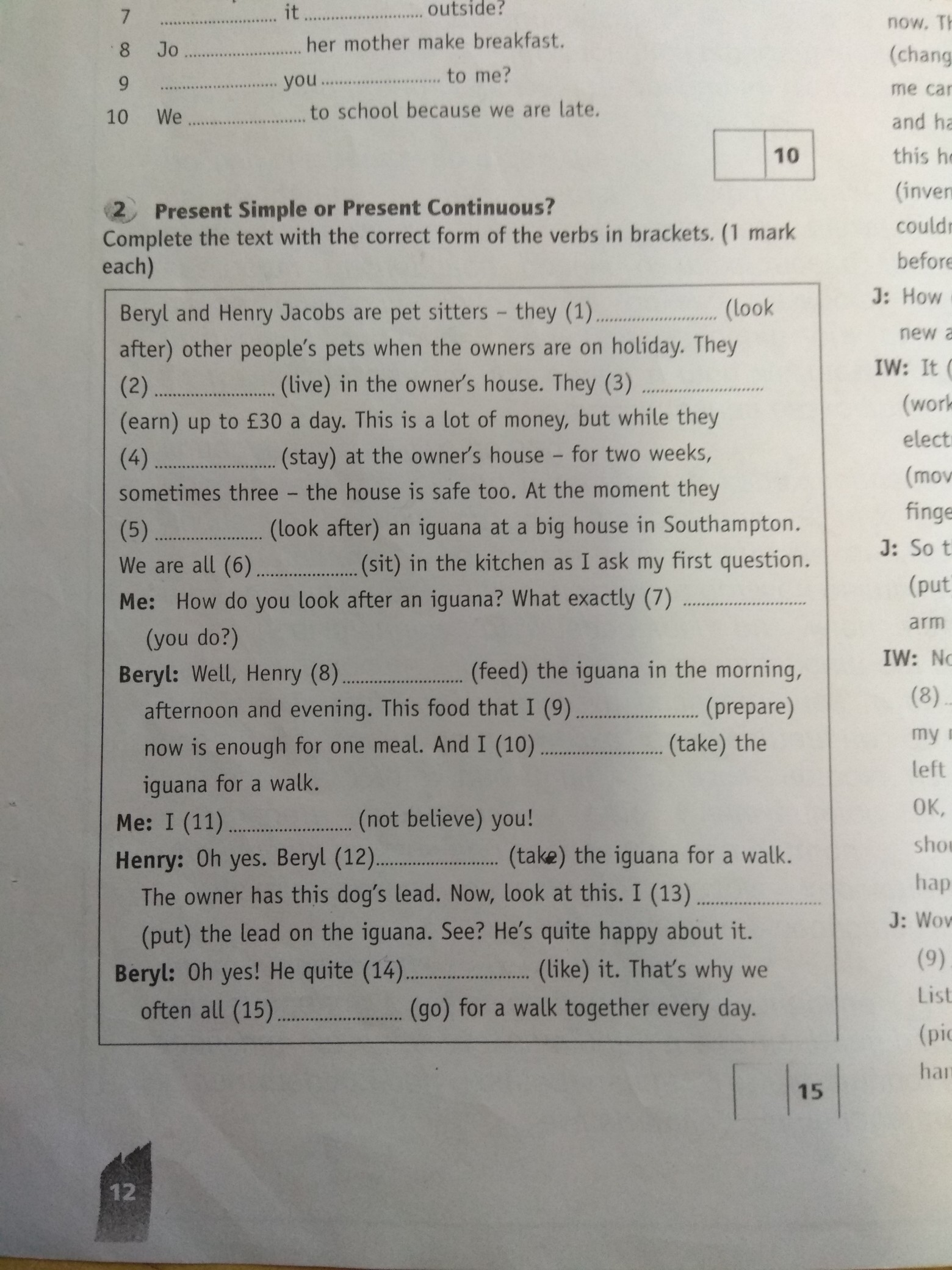 1) they look after 2) live 3) earn 4) are staying 5) looking after 6) sitting 7) do you do 8) feeds 9)am preparing 10) am going to take 11) don't believe 12)takes 13)am putting 14)likes 15)go