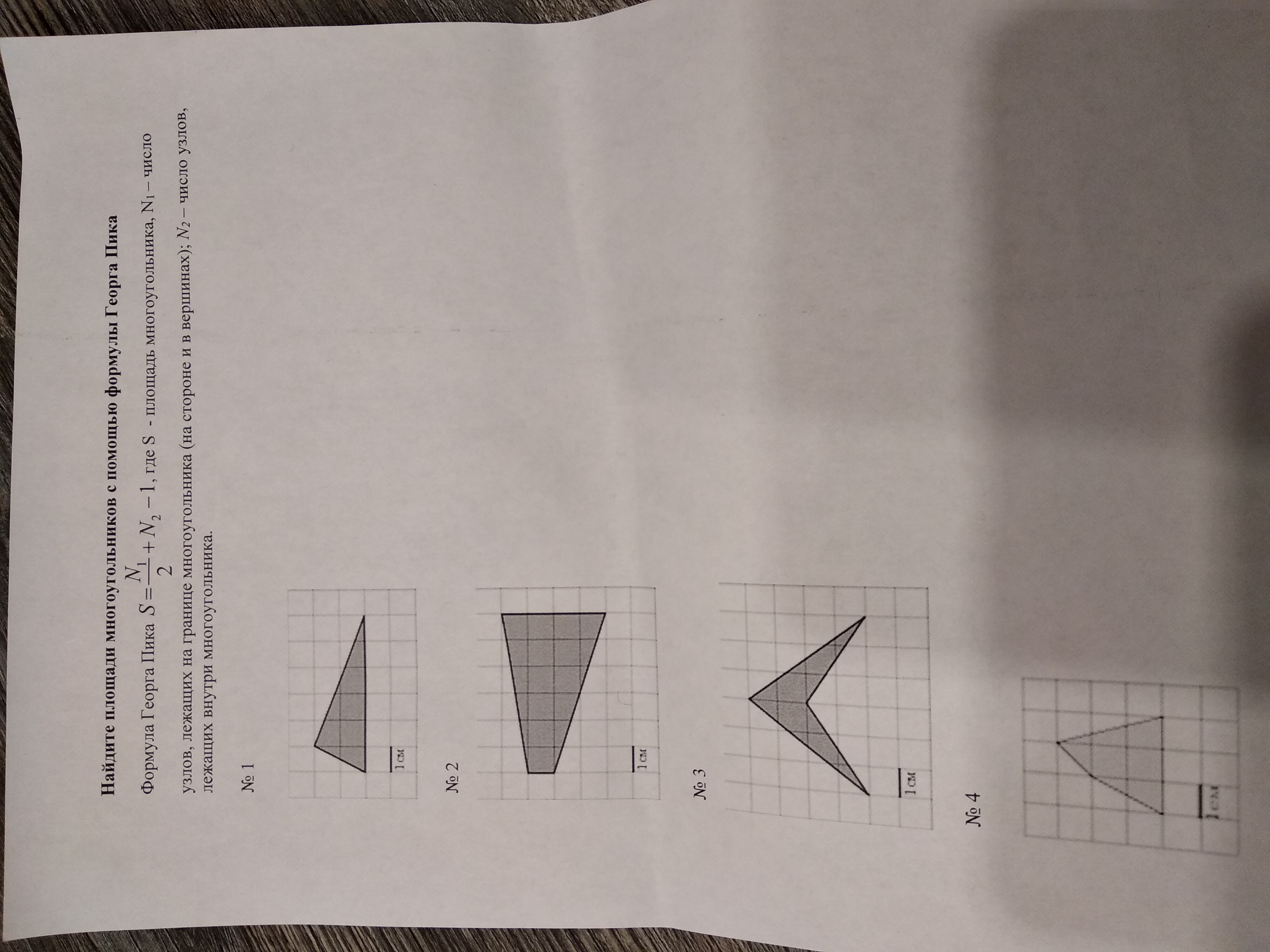 В + Г / 2 − 1, где В — количество целочисленных точек внутри многоугольника, а Г — количество целочисленных точек на границе многоугольника. В частности, площадь треугольника с вершинами в узлах и не содержащего узлов ни внутри, ни на сторонах (кроме вершин), равна 1/2.