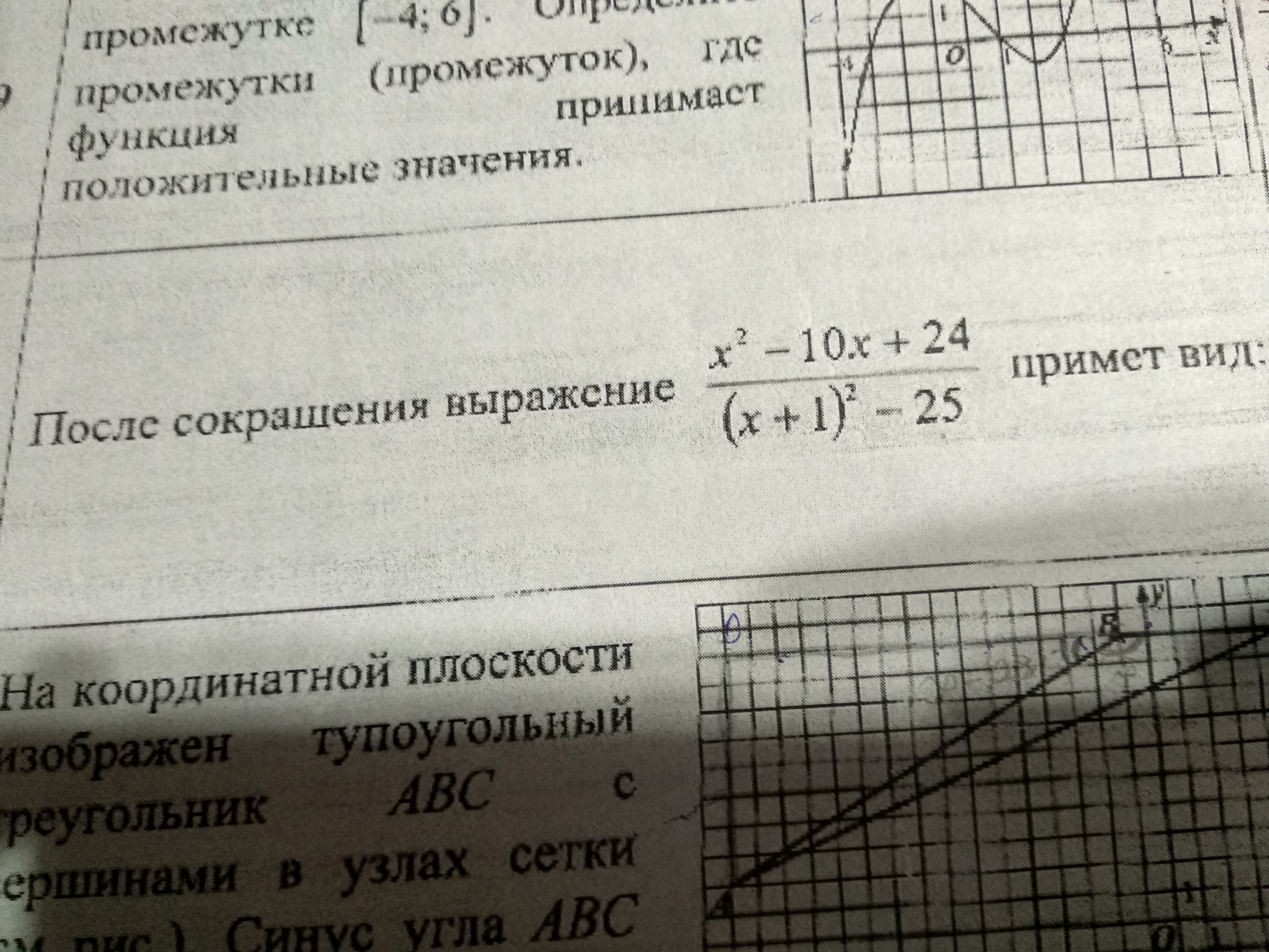 (x^2 - 10x + 24) / ((x+1)^2 - 25) = ((x-6)(x-4)) / ((x+1 - 5)(x+1+5))=((x-6)(x-4)) / ((x-4)(x+6))
