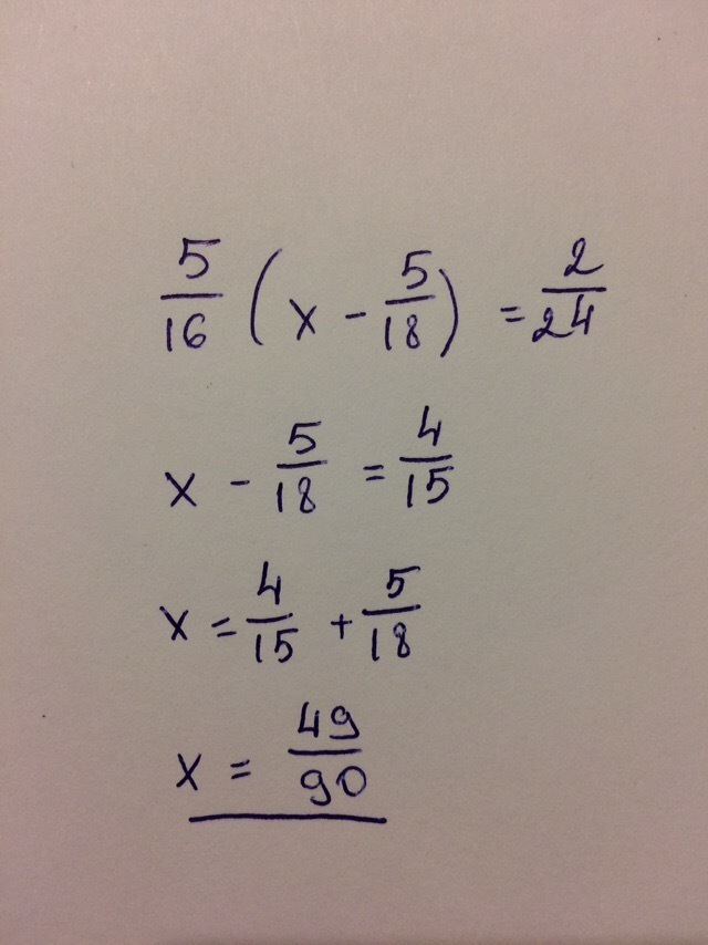 Найдите корень уравнения 5/16 (x-5/18)=2/24.Какому из неравенств удовлетворяет полученный корень?