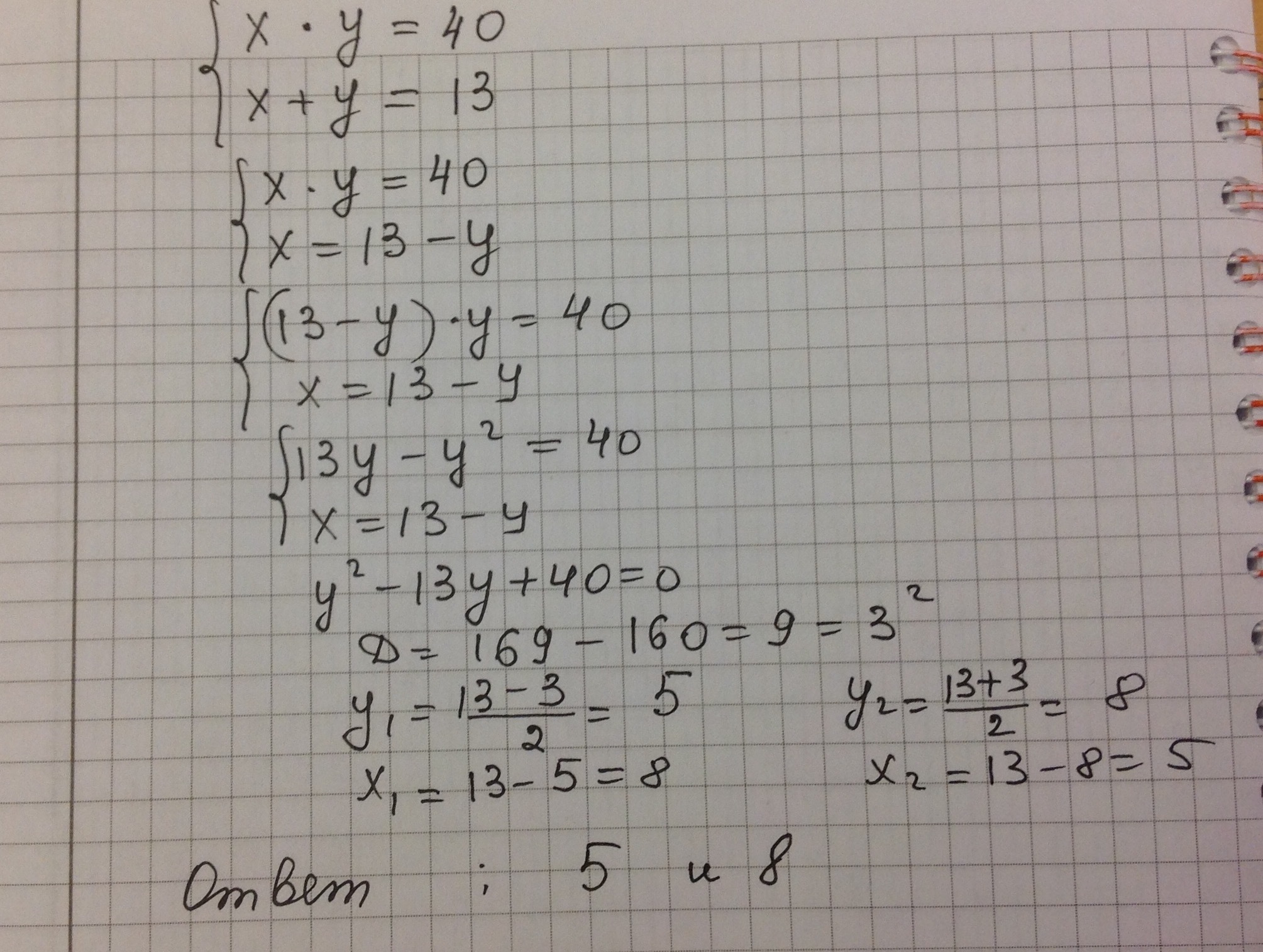 зделайте так что бы два слова когда умножалась должно быть 40 а когда сложить должно быть 13 как найти эти два цифра пж помочь прошу 25 балов
