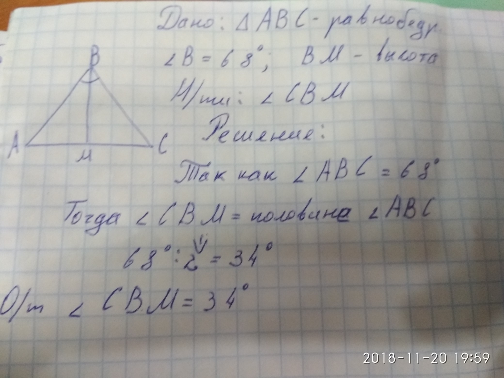 если в равнобедренном треугольнике ABC с основанием AC проведена высота BM и Угол ABC=68 градусам то угол CBM=