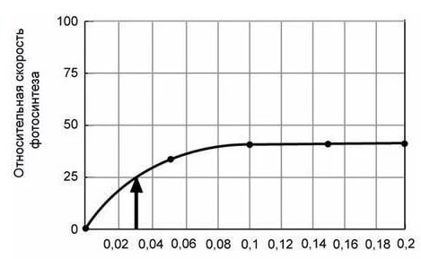 Превет, не знаю как определять, но я нашла таблицу соотношений скорости и концентрации (см.приложения). Получается примерно 30 скорость фотосинтеза.